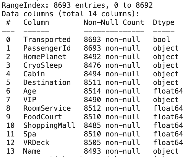 - 12 variables for each passenger and a column for successfully transported or not (y variable). Total 8,693 rows for training set, and 4,277 rows for test set.